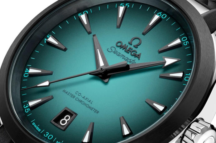 Available in 38mm and 41mm stainless steel cases with a matte black ceramic bezel, the new best replica Omega Seamaster Aqua Terra Turquoise watches are defined by their luminescent turquoise varnish dial with a gradient effect that turns to black. The trapezoidal hour markers and hands, with the hour hand distinguishing itself with an arrow tip, are black PVD coated and filled with white Superluminova, emitting a blue in low-light conditions for maximum legibility. Matching the dial colors, the structured rubber strap, which is seamlessly integrated into the case, includes turquoise stitching. Likewise color-coordinated is the date indication at 6 o’clock.