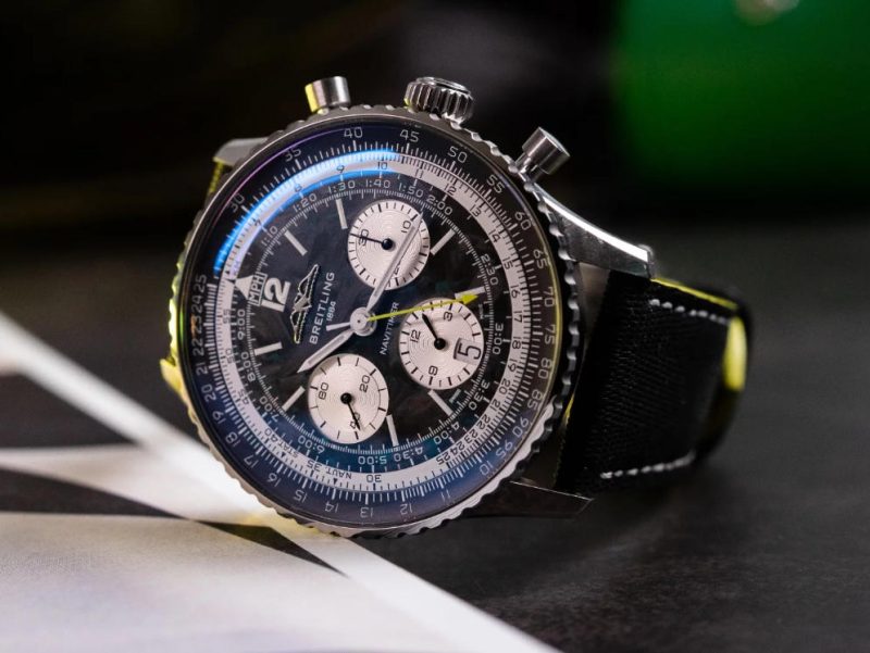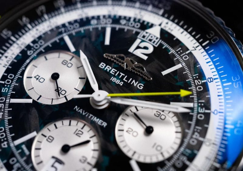 I’ve talked enough about the past, so let’s have a look at the present. The watch before us is a derivative of the 43mm Navitimer B01, expectedly featuring subtle hints of British racing green. What I presume was the real challenge is making the Navitimer’s iconic but 70-year-old design work with the cutting-edge nature of today’s Formula 1. To do that, Buy replica Breitling watches chose the chopped carbon fibre dial with very subtle green mottling, setting it against a classic reverse panda colourway. There is no Aston Martin branding visible dialside, which is not something I mind, but I do wonder whether Breitling chose the AOPA logo on purpose, subtly hinting at the car brand’s winged badge.