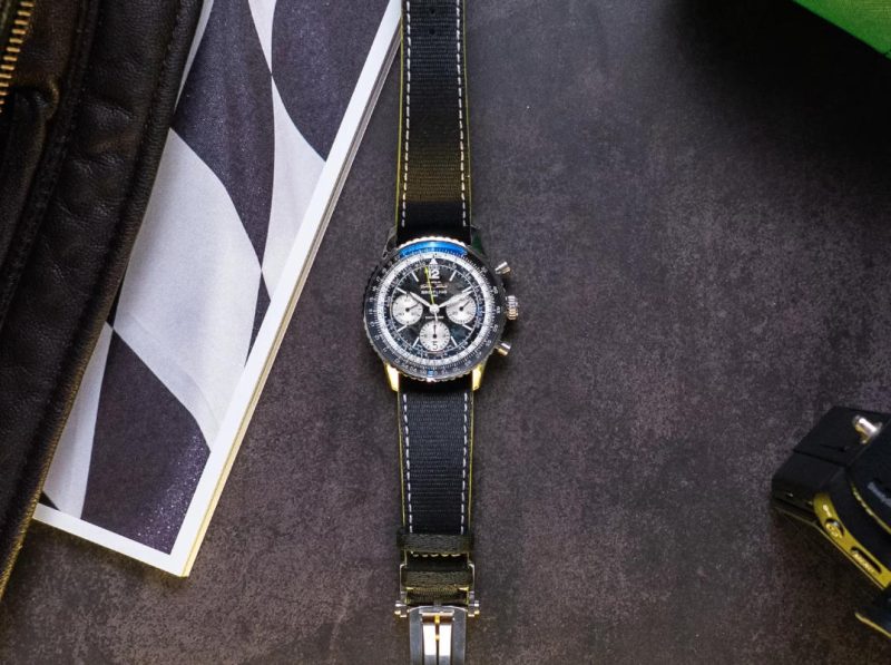 Apart from the green (and electric yellow) highlights hinting at the Aston Martin partnership, the only overt confirmation of it is visible on the winding rotor of the in-house B01 calibre. This tried-and-true performer is Breitling’s premier (see what I did there?) choice for its chronographs, offering a column wheel and vertical clutch architecture alongside a 70-hour power reserve.